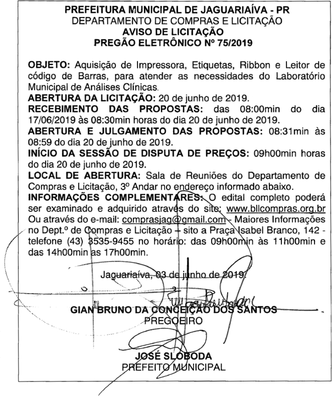 Aviso de Licitação Pregão Eletrônico Nº 75/2019