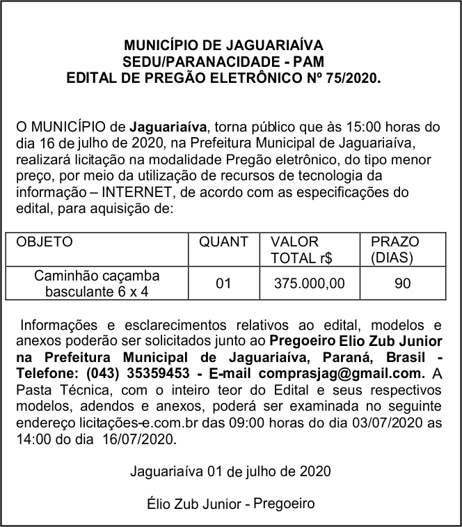 Aviso de Licitação Pregão Eletrônico Nº 75/2020