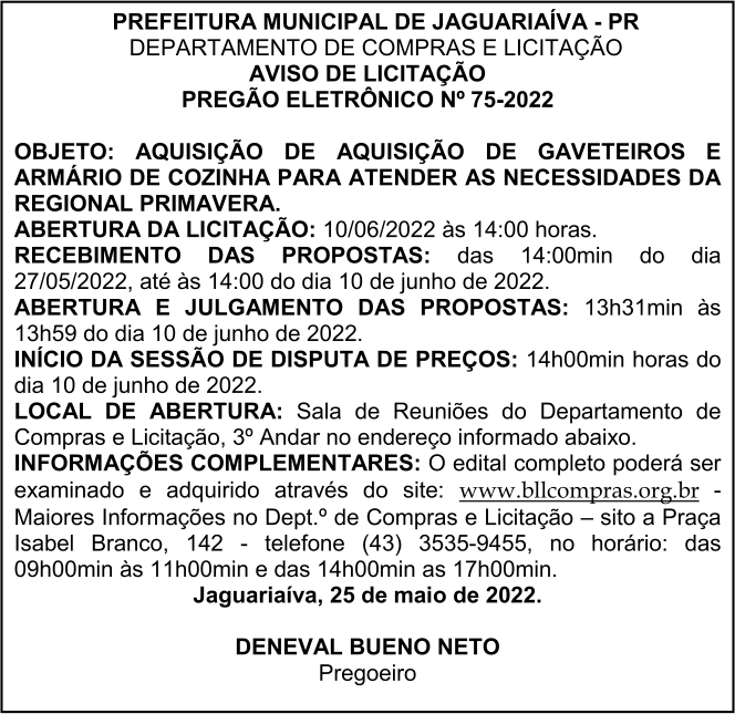 Aviso de Licitação Pregão Eletrônico Nº 75/2022