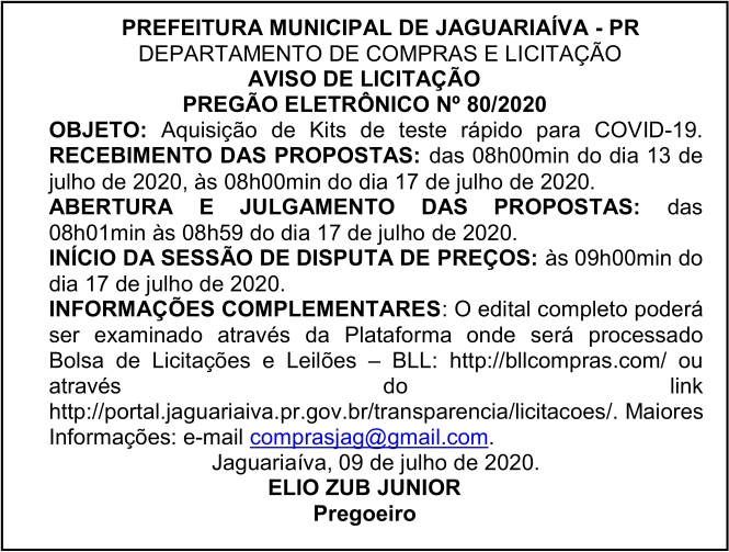 Aviso de Licitação Pregão Eletrônico Nº 80/2020