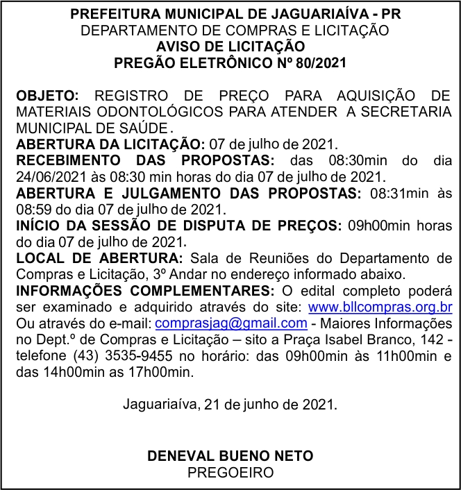 Aviso de Licitação Pregão Eletrônico Nº 80/2021