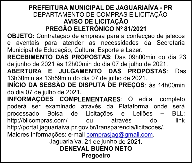 Aviso de Licitação Pregão Eletrônico Nº 81/2021