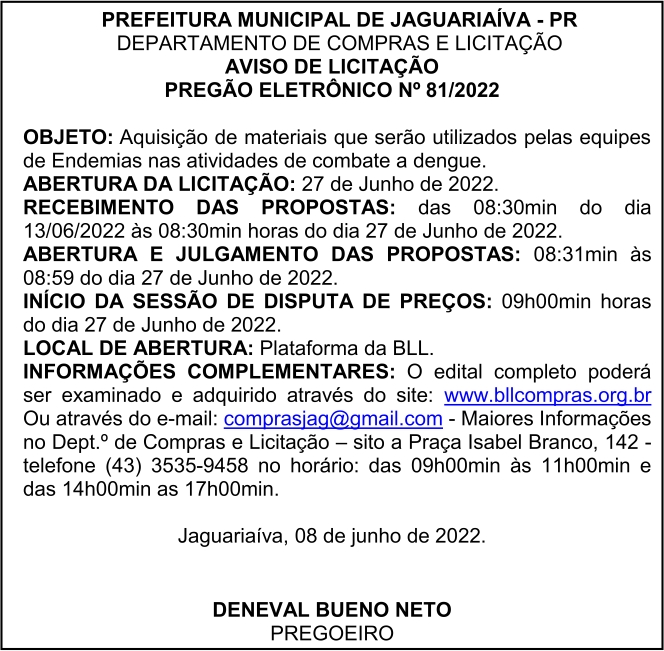 Aviso de Licitação Pregão Eletrônico Nº 81/2022
