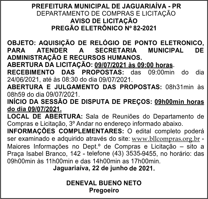 Aviso de Licitação Pregão Eletrônico Nº 82/2021