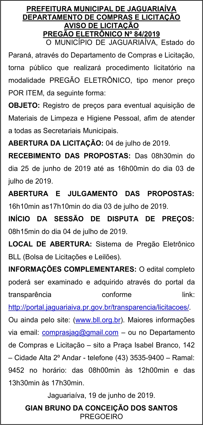Aviso de Licitação Pregão Eletrônico Nº 84/2019