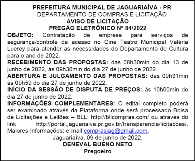 Aviso de Licitação Pregão Eletrônico Nº 84/2022