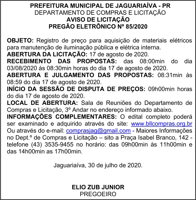 Aviso de Licitação Pregão Eletrônico Nº 85/2020