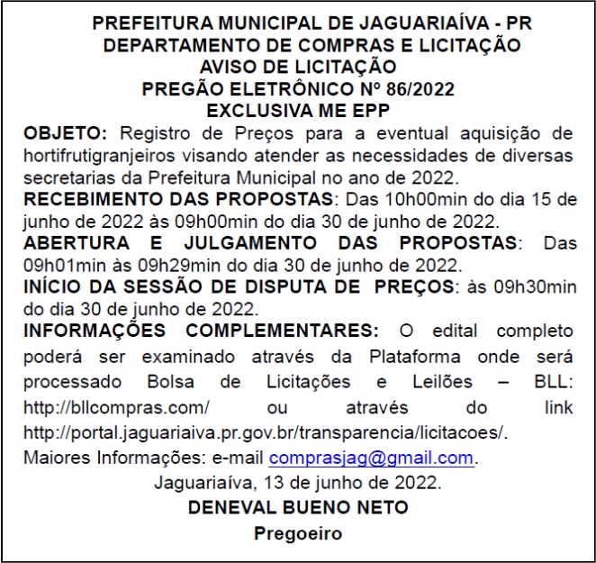 Aviso de Licitação Pregão Eletrônico Nº 86/2022