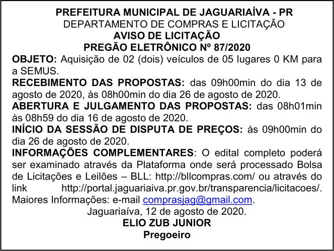 Aviso de Licitação Pregão Eletrônico Nº 87/2020