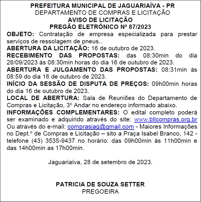Aviso de Licitação Pregão Eletrônico Nº 87/2023
