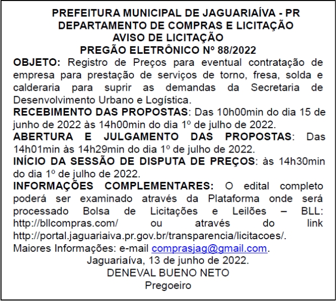 Aviso de Licitação Pregão Eletrônico Nº 88/2022