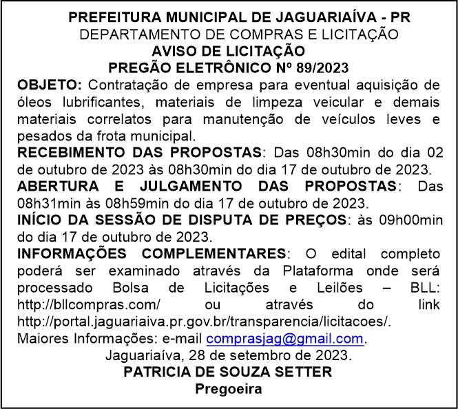 Aviso de Licitação Pregão Eletrônico Nº 89/2023