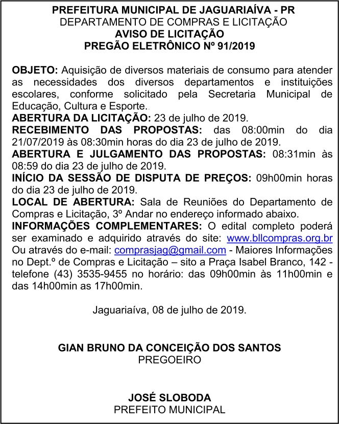 Aviso de Licitação Pregão Eletrônico Nº 91/2019