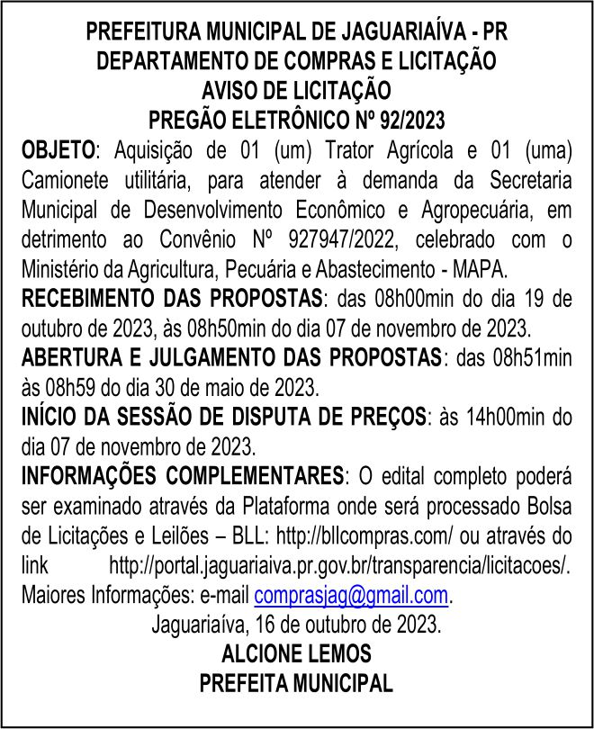 Aviso de Licitação Pregão Eletrônico Nº 92/2023