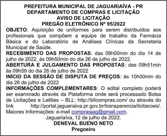 Aviso de Licitação Pregão Eletrônico Nº 95/2022
