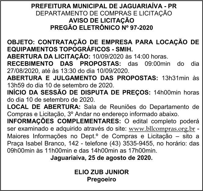 Aviso de Licitação Pregão Eletrônico Nº 97/2020