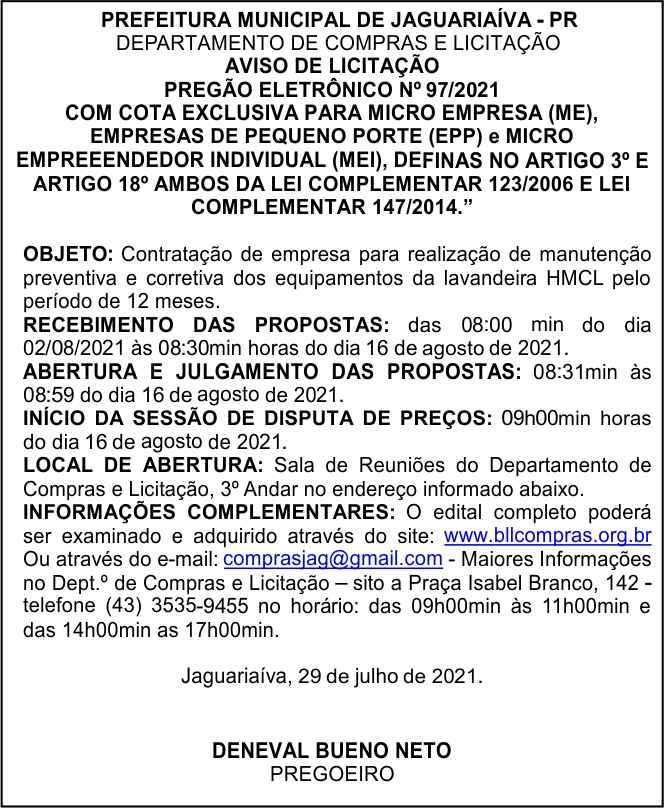Aviso de Licitação Pregão Eletrônico Nº 97/2021