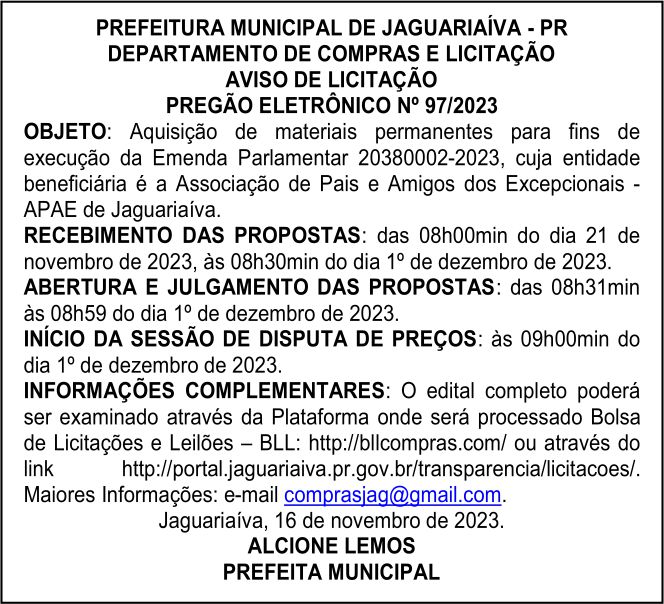 Aviso de Licitação Pregão Eletrônico Nº97 – 2023