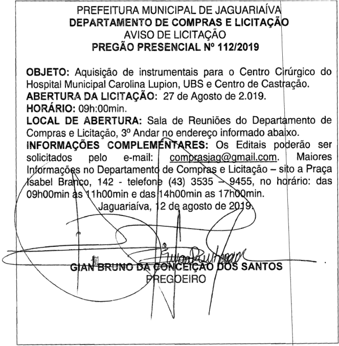 Aviso de Licitação Pregão Presencial 112/2019