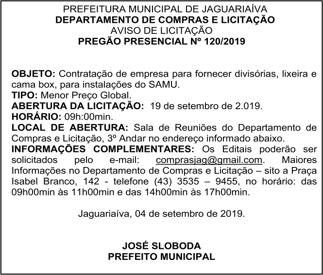 Aviso de Licitação Pregão Presencial 120/2019