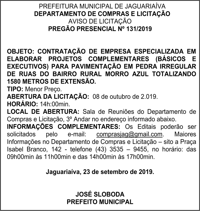 Aviso de Licitação Pregão Presencial 131/2019