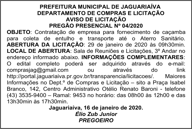Aviso de Licitação Pregão Presencial Nº 04/2020