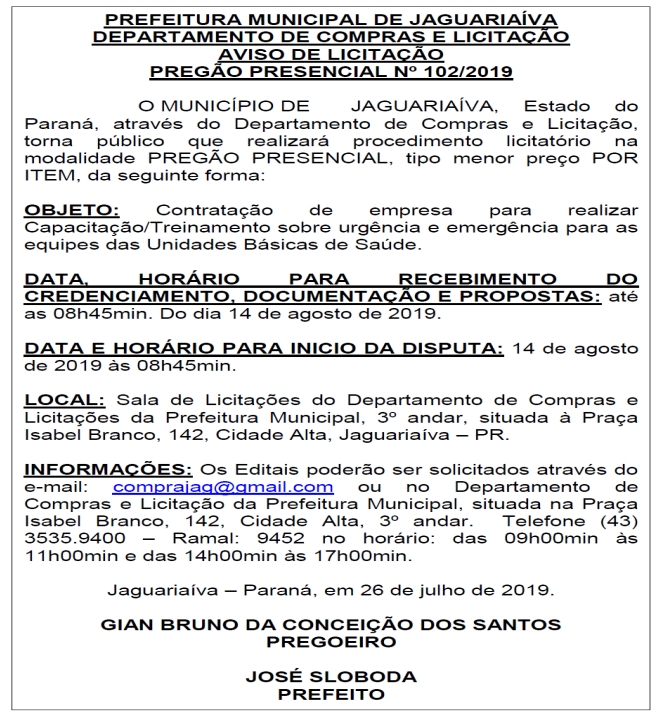 Aviso de Licitação Pregão Presencial Nº 102/2019