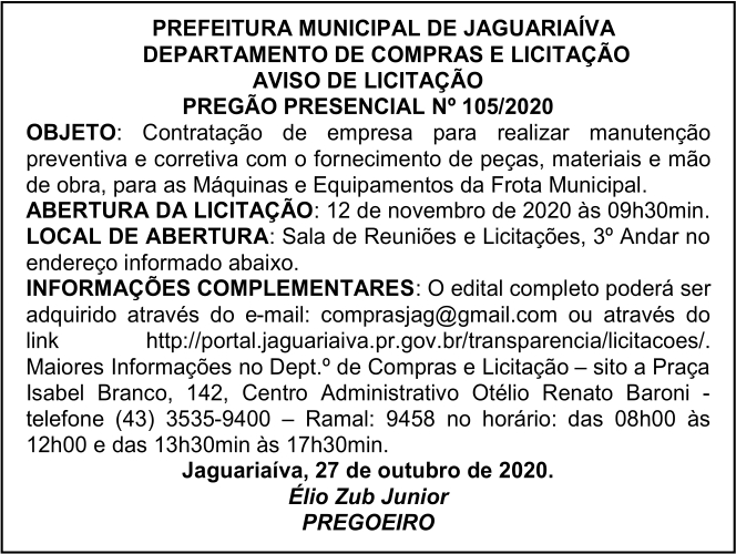 Aviso de Licitação Pregão Presencial Nº 105/2020
