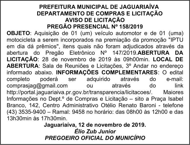 Aviso de Licitação Pregão Presencial Nº 158/2019