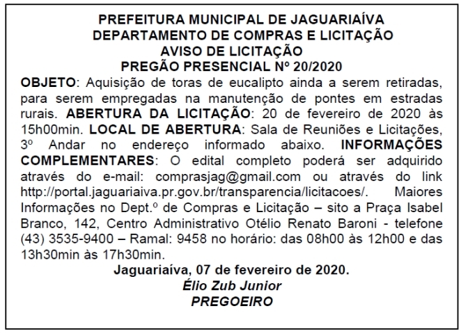 Aviso de Licitação Pregão Presencial Nº 20/2020