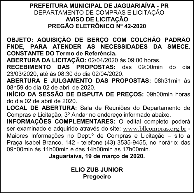 Aviso de Licitação Pregão Presencial Nº 42/2020