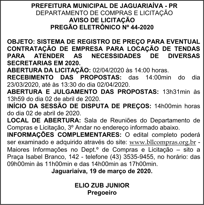 Aviso de Licitação Pregão Presencial Nº 44/2020