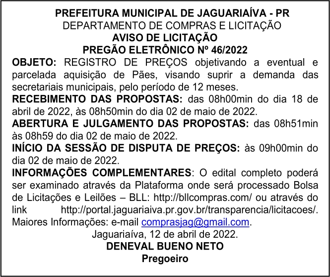 Aviso de Licitação Pregão Presencial Nº 46/2022