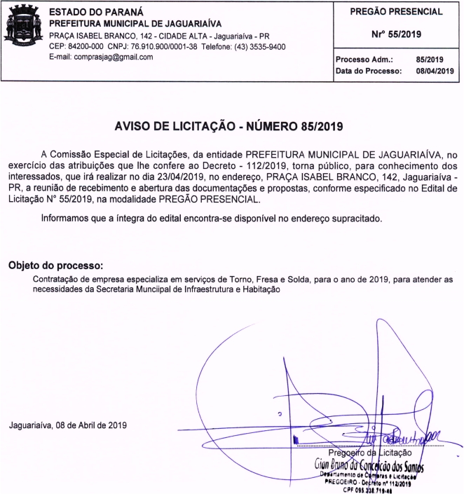Aviso de Licitação Pregão Presencial Nº 55/2019