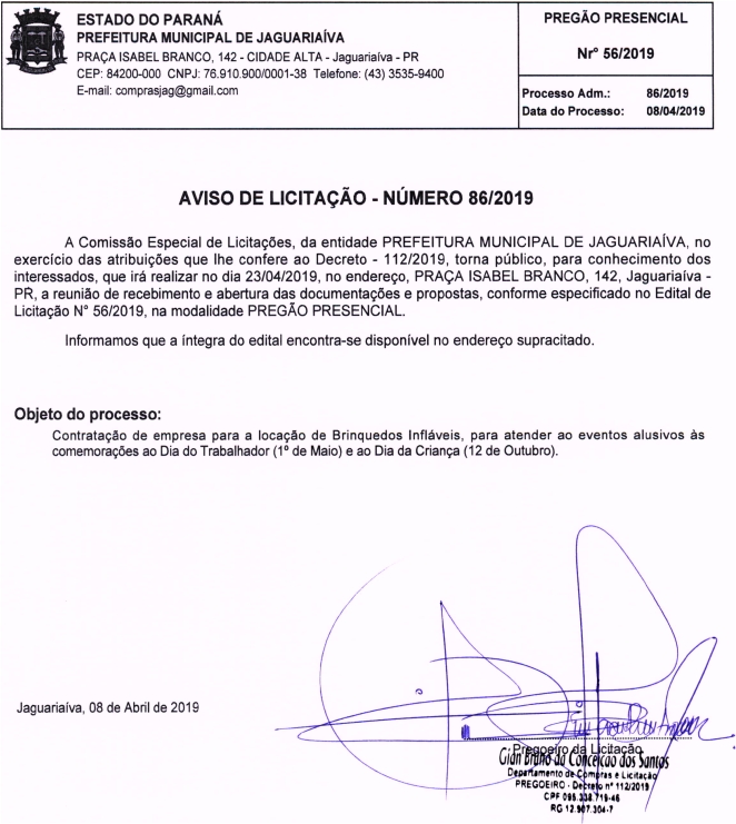 Aviso de Licitação Pregão Presencial Nº 56/2019