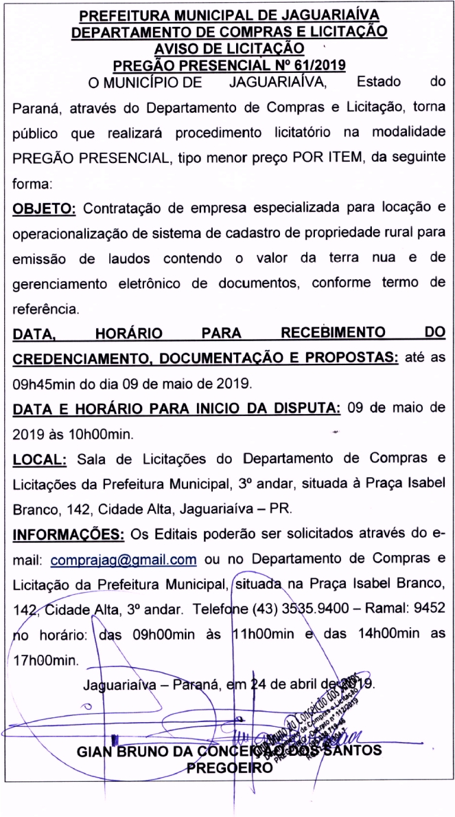 Aviso de Licitação Pregão Presencial Nº 61/2019