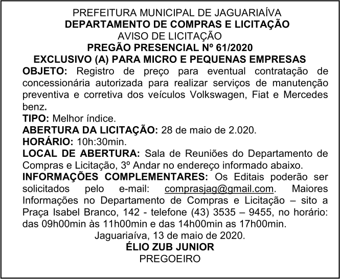 Aviso de Licitação Pregão Presencial Nº 61/2020
