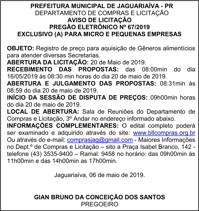 Aviso de Licitação Pregão Presencial Nº 67/2019