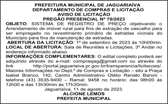 Aviso de Licitação Pregão Presencial Nº 70/2023
