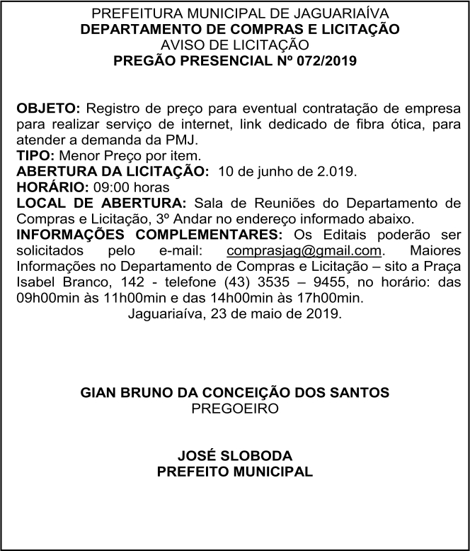 Aviso de Licitação Pregão Presencial Nº 72/2019