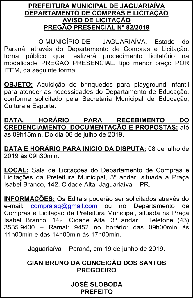 Aviso de Licitação Pregão Presencial Nº 82/2019