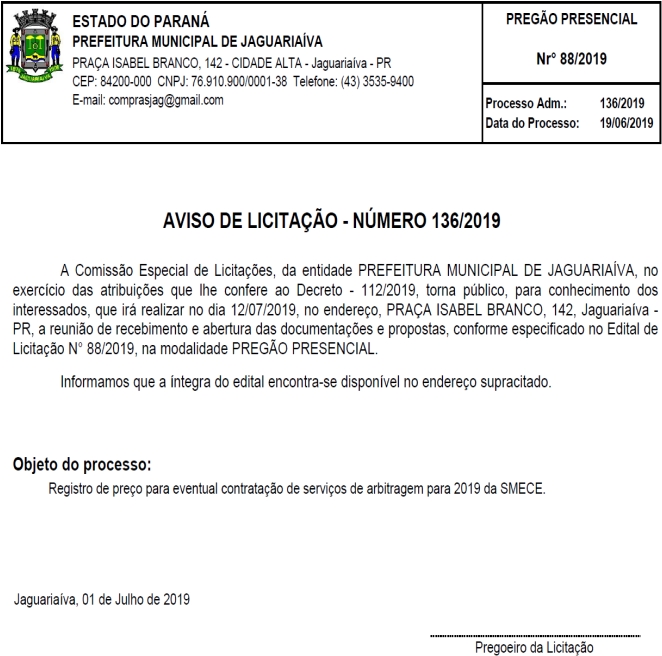 Aviso de Licitação Pregão Presencial Nº 88/2019