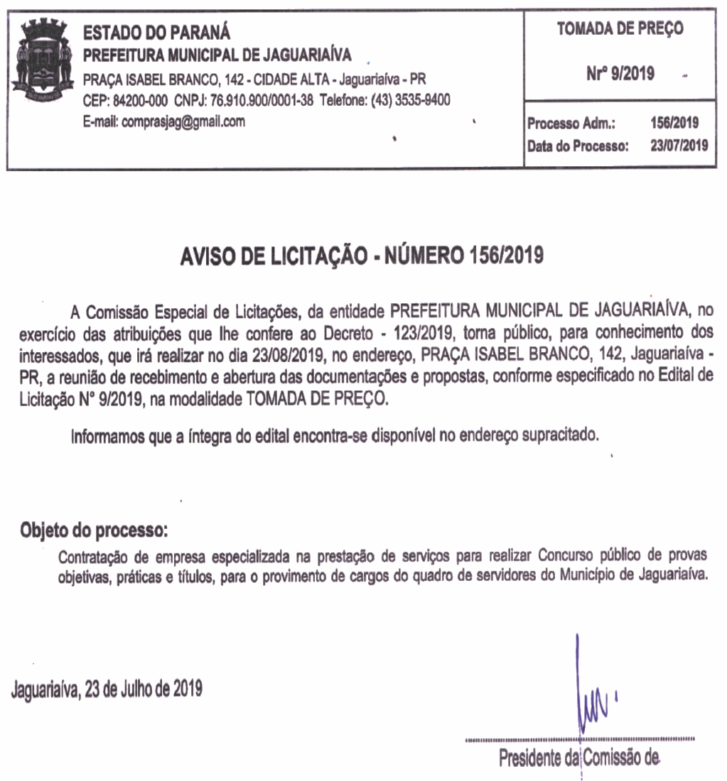 Aviso de Licitação Tomada de Preço 09/2019