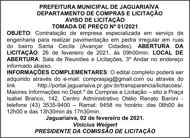 Aviso de Licitação Tomada de Preço Nº 01/2021