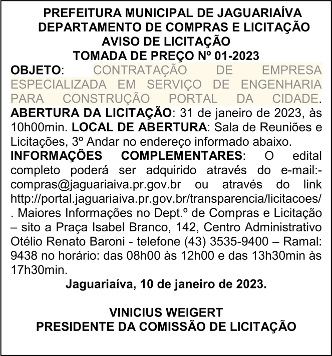 Aviso de Licitação Tomada de Preço Nº 01/2023