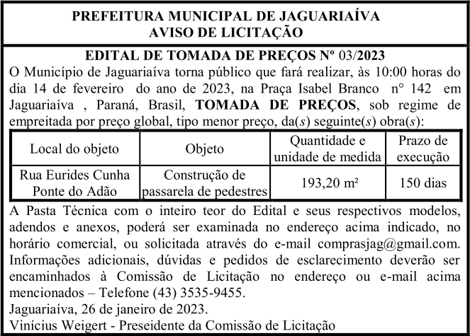 Aviso de Licitação Tomada de Preço Nº 03/2023