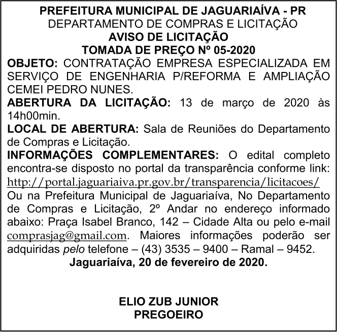 Aviso de Licitação Tomada de Preço Nº 05/2020