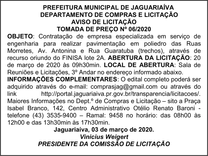 Aviso de Licitação Tomada de Preço Nº 06/2020