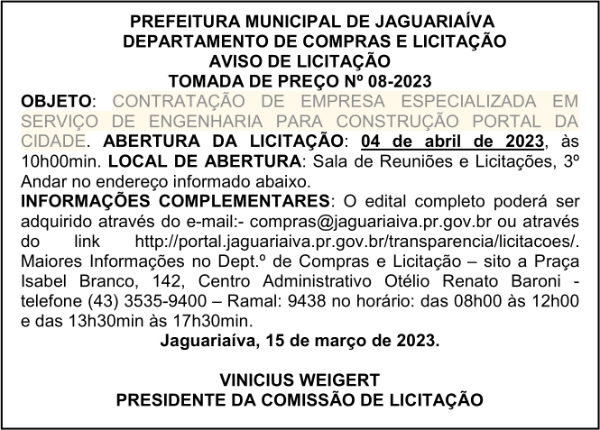 Aviso de Licitação Tomada de Preço Nº 08/2023