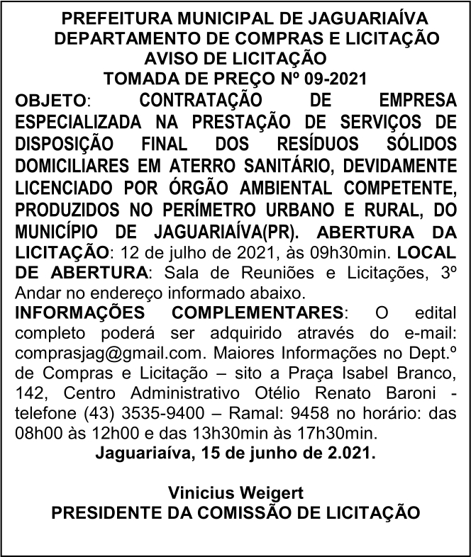 Aviso de Licitação Tomada de Preço Nº 09/2021